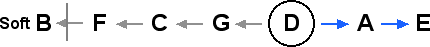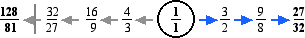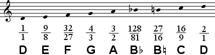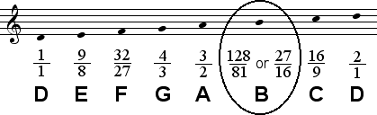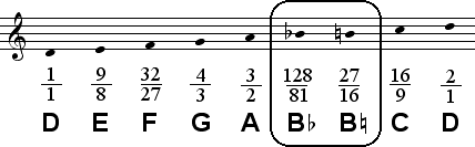 In certain contexts, particulary those involving the tritone between F and B, the lower tone 128/81 may sound more suitable for B than the Dorian B, 27/16. Both tones are given below.