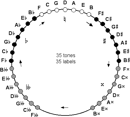 Since the diatonic pattern deals directly with halfsteps in 12ET, it is a convenient way of illustrating these relationships, but the table below having pitches arranged in fifths order is more compact. There are 35 possible pitch names (7 letters × 5 accidentals) in the traditional system.