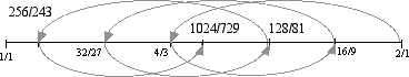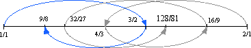 Just as in Mixolydian, the mediant 32/27 is replaced by 81/64. Additionally, the subtonic 16/9 is replaced by the higher tone 243/128 in the Ionian mode. This tone is no longer referred to as the subtonic, but has rather been given the name leading tone, due to its closer proximity to the tonic which is said to lead the ear towards the tonic.