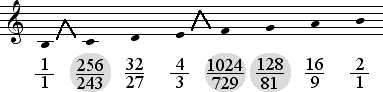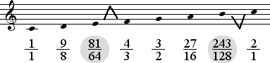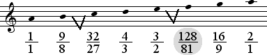 The submediant 27/16 is replaced by the lower tone 128/81.