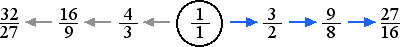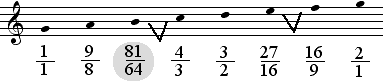 By shifting the central tone from D to G, the Mixolydian mode is formed. The mediant 32/27 is replaced by the higher tone 81/64.