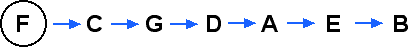 In Western music, the term mode has complex implications, and historically speaking modes are a tremendously complicated matter; however, the modern diatonic modes are just simple permutations of the seven natural tones, and the arrangement of letters around D can serve as the roadmap for our tour of the modern diatonic modes. Below, these modes are introduced in order according to the Dorian arrangement, first moving away from the center D to the right in the order D A E B, and then moving away from the center D to the left in the order G C F. As the central tone shifts from the center D to the right, the number of tones which are lower in relation to the tonic is increased. As the central tone departs from the center D to the left, the number of tones which are higher in relation to the tonic is increased.
