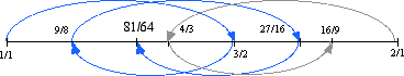 Each mode is shown below in notation with ratios and wedges showing halfsteps. The modes are presented as above, in fifths order, first moving away from the center D to the rightmost extreme B, increasing the number of tones which are lower in relation to the tonic, and then returning to the center D and moving to the leftmost extreme F, increasing the number of tones which are higher in relation to the tonic. Dorian tones and tones of other modes which differ from those of Dorian are shaded.