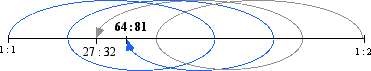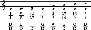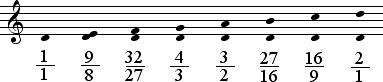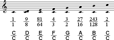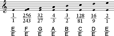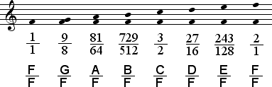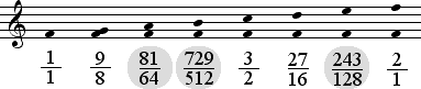 Just as in Mixolydian, the Third 27:32 is replaced by 64:81. Additionally, the Seventh 9:16 is replaced by the larger Seventh 128:243 in the Ionian mode.