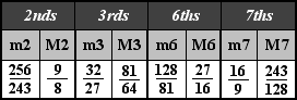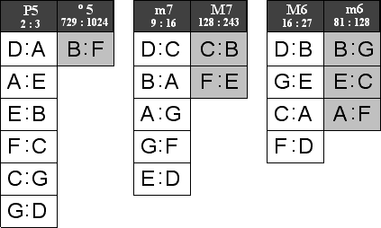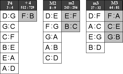 The center of the system D serves as the first and last letter in the left half of each column. The two rows of three columns each show inversional relationships above and below; for example, Fourths are placed above Fifths to show that these intervals are inversions of each other. The qualities of each interval are also arranged so that inversions are placed in the same half of each column; for example, Minor Thirds are inversions of Major Sixths. The inversional relationships may also be seen in the numbers which make up the interval ratios as well as the letter names of the tones; for example, the Major Sixth 16:27 is the inversion of the Minor Third 27:32, which may be expressed as D:B inverting to B:D.