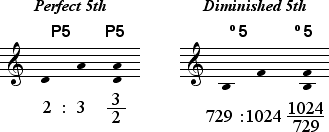 When an interval normally classified as perfect is smaller than the natural perfect version, the quality of the smaller interval is called diminished. Thus the Fifth 729:1024 in Locrian is called a Diminished Fifth while the Fifth in Dorian 2:3 is called a Perfect Fifth. A degree symbol ° indicates a Diminished quality.