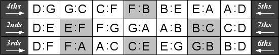 The cyclical structures of the interval qualities are summarized in the table below, which uses only shading to show qualities according to the tables above, and shows inversions simply as a change of direction from left to right.