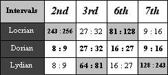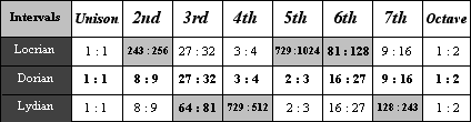 These three modes are shown below in notation with ratios. Lydian and Locrian intervals which differ from those of Dorian are shaded just as they are in the table above.