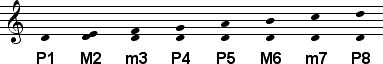 The two sizes of imperfect intervals have been classified throughout history in various languages simply as large or small. The modern terms for these two sizes are called Major and Minor, respectively. A lowercase letter m preceeding an interval number indicates a Minor quality while an uppercase M indicates a Major quality. The differing distances for each pair of imperfect intervals are shown in the figures below. The Second 243:256 is smaller than the Second 8:9. Therefore, the Dorian Second 8:9 is called a Major Second while the Locrian Second 243:256 is called a Minor Second.