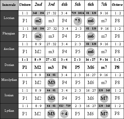 Having established the qualities of natural intervals by ratios and notation, we return to the expression of tones as letters. The table below shows the natural tones of each mode expressed as letters. Tones which differ from those of Dorian are shaded.