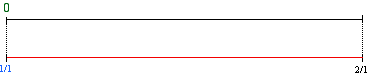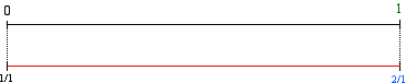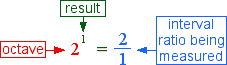 The top number line looks like a normal ruler; the tone 1/1 measured against the octave results in a distace of zero, as would be expected. A second numerical statement supplies a maximum value the other end of the ruler.