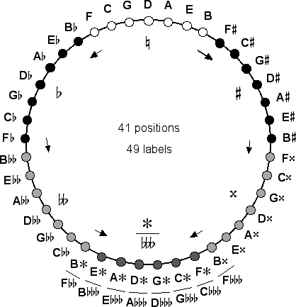 As demonstrated in the section on triple accidentals above, there are eight enharmonic positions. For all letters and accidentals, 49 labels including enharmonics, there are 41 unique positions, as shown in the circle below.