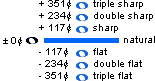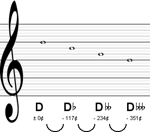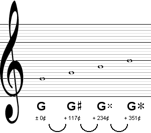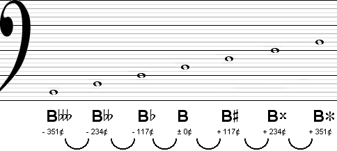 All combinations of a given letter with various accidentals refer to different staff positions. When applied to the same letter, seven accidentals correspond to seven positions differing by ± 117 cent increments, as shown in the table below.