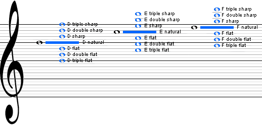 Double sharps and double flats usually correspond to positions which neighbor natural positions on the staff. Sometimes these positions neighbor sharp or flat positions. Neighboring pairs of double sharps and naturals, double flats and naturals, double sharps and sharps, and double flats and flats are shown below on a treble staff. Again, the notes of each set differ from one another in pitch roughly by a comma.