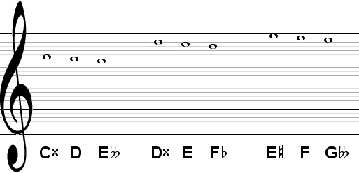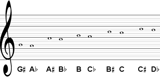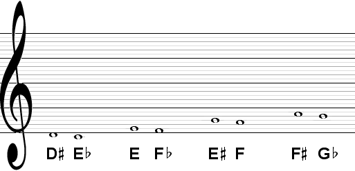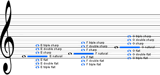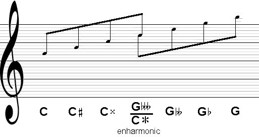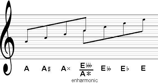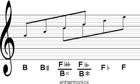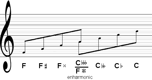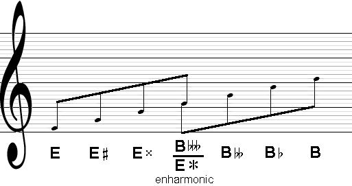 Note that the interval from B to F shows two overlapping enharmonic positions.