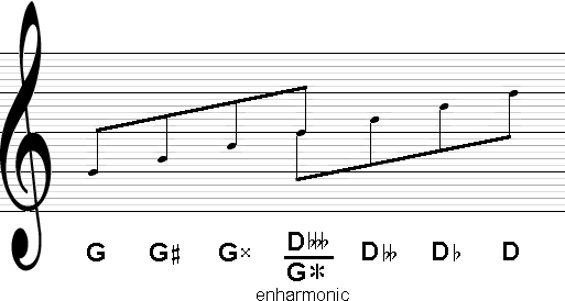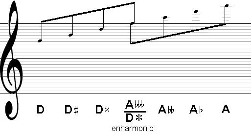NOTE: As a result of this chain of fifths basis, sharps are higher than neighboring flats, double sharps are higher than neighboring naturals, and double flats are lower than neighboring naturals. These relationships correspond to the implications of early Western music theory; however, during a slightly later period of Western history, all of these relationships were reversed. For several centuries, sharps were lower in pitch than neighboring flats, double sharps were lower than neighboring naturals, and double flats were higher than neighboring naturals. These reverse relationship are easily shown by using enharmonic shifts.