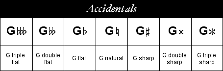 The spoken and written forms are the same from left to right. For example, accidentals of G are shown in the table below, with spoken equivalents given below each label.
