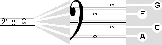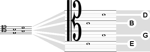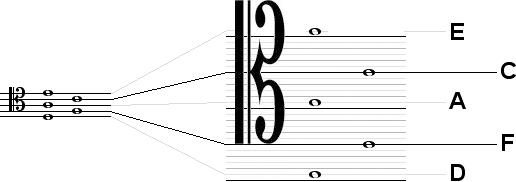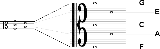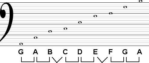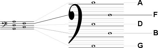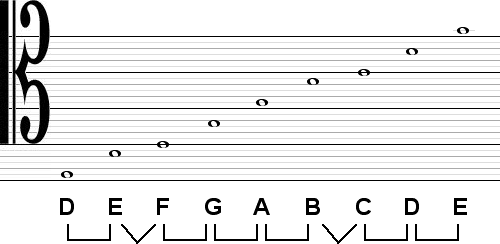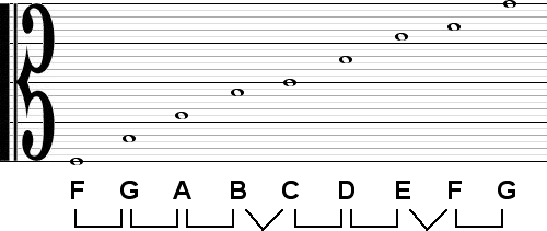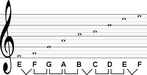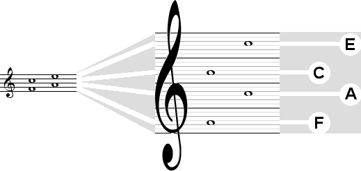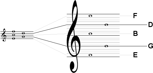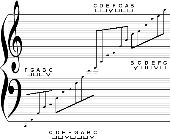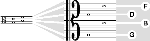The positions of the staff are based on the conventional premise of seven letters which represent a chain of fifths, shown below in ascending so-called natural scale order. The rationale for using these letters is given in the Systematic Music Theory area of the website.