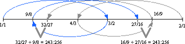The appearance of this smaller interval, 243:256, marks an arrival point, and a temporary stopping place for the derivation of our system. A wedge-like figure is used to represent this interval.