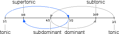 The names of these two new tones correspond to thier proximities to the tonic tones and the dominant tones. The tone 32/27 is roughly in the middle between the tonic and the dominant, while the tone 27/16 is roughly in the middle between the upper tonic and the subdominant. The word mediant means middle. 32/27 is the called the mediant while 27/16, being between then tonic and subdominant, is called the submediant. Again the names of this pair of tones reminds us that they are inversions of each other.