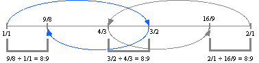 Notice that an interval, the distance between two tones, is found by dividing the higher tone by the lower tone, and the result is expressed with a colon in the form lower : higher. This form is used to distinguish intervals from tones, which are expressed with a slash in the form higher / lower. The interval 8:9 is significant, and a bracket-like figure is often used to represent this interval.