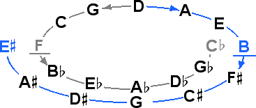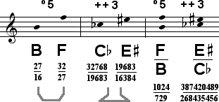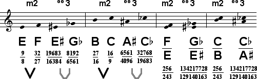 are related to the end tones of the diatonic naturals, B and F, by commas, as shown by the grey