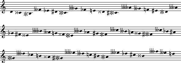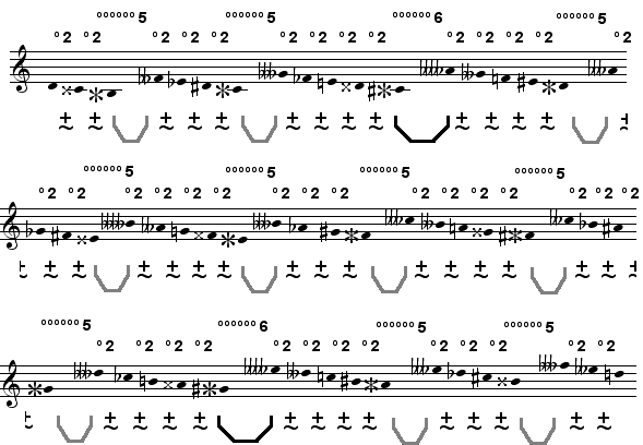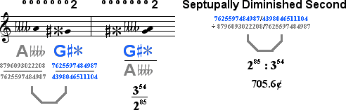 With ratios containing up to a whopping 13 digits, the 55 tone system includes new quadruple accidentals which correspond to adjacent scale steps notated a sixth apart in terms of raw staff distance, as shown below.