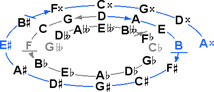 This is a system with rather flat fifths but fairly good thirds. The alternate method of handling the system works better in this case; by eliminating the two sextupally diminished fifths, the system of 41 Tone Equal Temperament, or 41ET, results.
