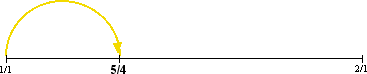 The vibrating segment is one fifth as long as the whole string, so we can call this segment 1/5. This segment also vibrates 5 times as fast as the first tone. The figure above is shown in yellow to signify that the number 5 represents the second new tone. The value of this tone, 5, is obviously larger than 2. To justify this tone, we use the relationship of duplication, dividing the tone by 2 twice, which gives us 5/2, and then 5/4, congruences of 5 which sound increasingly lower in pitch.