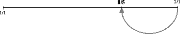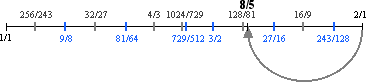 The second new pitch 5/4 was initially produced above the source tone, and the new pitch 8/5 is initially produced below it, so that these two tones are inversions of each other. Just as 5/4 is shown with an arrow pointing above and to the right from the lower tonic, its inversion 8/5 is shown with opposite orientation from the higher tonic.