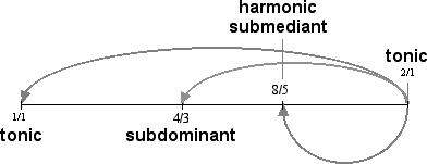 Intervals produced below the tonic are given the prefix sub. This is one way to lead to the idea of a subharmonic series, or a series of harmonics produced below the tonic rather than above it. Such a series is given below, with harmonic numbers shown upside down to emphasize the mirror relationship of this sub-series to the conventional harmonic series.