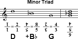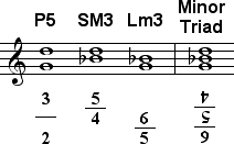 The minor triad also contains a Perfect Fifth, 2:3, and a Small Major Third, 5:4 is incidentally found between the two upper tones of the triad.