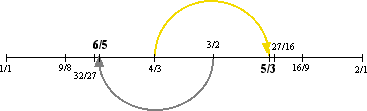 If we put the harmonic mediant and harmonic submediant together with the diatonic chain, we can clearly show how tones are derived from either a 3rd or 5th harmonic. The 3rd harmonic is shown on the horizontal axis, and the 5th harmonic is on the vertical axis.