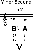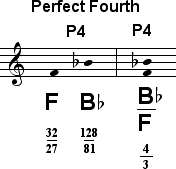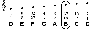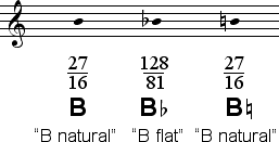 In certain contexts, particulary those involving the tritone between F and B, the lower tone 128/81 may sound more suitable for B than the Dorian B, 27/16. Both tones are given below.