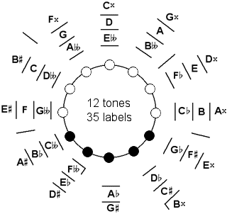 Since the diatonic pattern deals directly with halfsteps in 12ET, it is a convenient way of illustrating these relationships, but the table below having pitches arranged in fifths order is more compact. There are 35 possible pitch names (7 letters × 5 accidentals) in the traditional system.