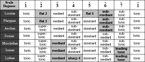 A similar table is given below, showing scale degree names instead of tone ratios. Only degrees which differ from those of Dorian are shaded.