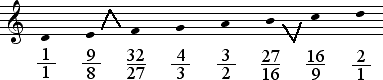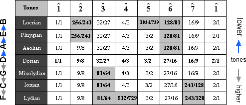 Each mode is shown below in notation with ratios and wedges showing halfsteps. The modes are presented as above, in fifths order, first moving away from the center D to the rightmost extreme B, increasing the number of tones which are lower in relation to the tonic, and then returning to the center D and moving to the leftmost extreme F, increasing the number of tones which are higher in relation to the tonic. Dorian tones and tones of other modes which differ from those of Dorian are shaded.