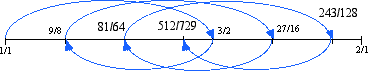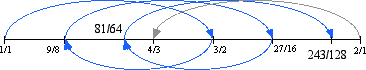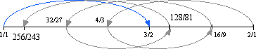 Just as in Mixolydian, the mediant 32/27 is replaced by 81/64. Additionally, the subtonic 16/9 is replaced by the higher tone 243/128 in the Ionian mode. This tone is no longer referred to as the subtonic, but has rather been given the name leading tone, due to its closer proximity to the tonic which is said to lead the ear towards the tonic.
