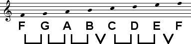 Shifting one more fifth to the left, from C to F, results in three tones differing from those of Dorian.