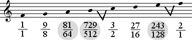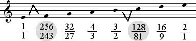 The submediant 27/16 is replaced by the lower tone 128/81.