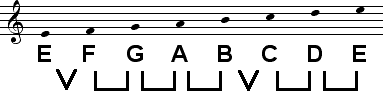 By shifting one more fifth to the right, from A to E, two tones differ from those of Dorian.