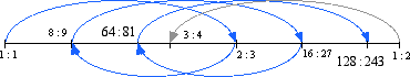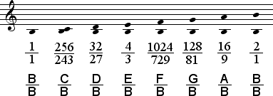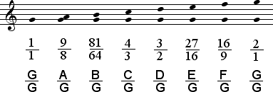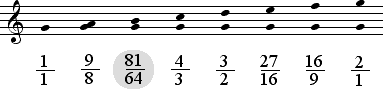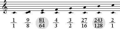 Just as in Mixolydian, the Third 27:32 is replaced by 64:81. Additionally, the Seventh 9:16 is replaced by the larger Seventh 128:243 in the Ionian mode.