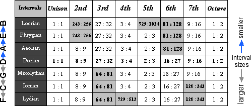 The following table shows all the natural harmonic intervals for each mode in notation and in ratios. The arrangement of modes follows the order given above, beginning with the center D Dorian and moving out by fifths towards B Locrian, increasing the number of smaller intervals, and then returning to the center D and moving to the left towards F Lydian, increasing the number of larger intervals. Dorian intervals and intervals of other modes which differ from those of Dorian are shaded.