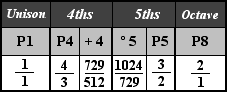 The differing distances of the Fourths and Fifths given by the values in the table are shown in the figures below. The Fourth 512:729 is larger than the Fourth 3:4.