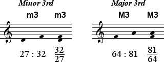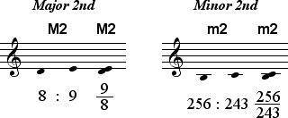 The two sizes of imperfect intervals have been classified throughout history in various languages simply as large or small. The modern terms for these two sizes are called Major and Minor, respectively. A lowercase letter m preceeding an interval number indicates a Minor quality while an uppercase M indicates a Major quality. The differing distances for each pair of imperfect intervals are shown in the figures below. The Second 243:256 is smaller than the Second 8:9. Therefore, the Dorian Second 8:9 is called a Major Second while the Locrian Second 243:256 is called a Minor Second.