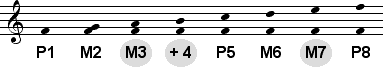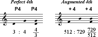 When an interval normally classified as perfect is larger than the natural perfect version, the quality of the larger interval is called augmented. Thus the Fourth 512:729 in Lydian is called an Augmented Fourth while the Fourth 3:4 in Dorian is a Perfect Fourth. The letter P preceeding an interval number indicates a Perfect quality while a plus sign + indicates an Augmented quality.