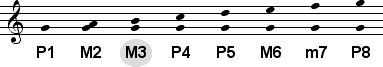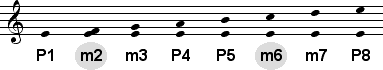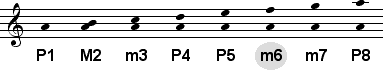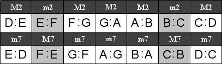 If we examine all of the intervals included above, we see a total of 13 different values. These 13 intervals are known as the diatonic intervals, as shown in the table below.