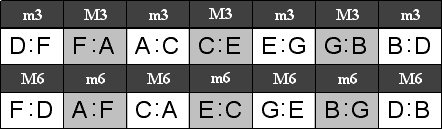 The center of the system D serves as the first and last letter in the left half of each column. The two rows of three columns each show inversional relationships above and below; for example, Fourths are placed above Fifths to show that these intervals are inversions of each other. The qualities of each interval are also arranged so that inversions are placed in the same half of each column; for example, Minor Thirds are inversions of Major Sixths. The inversional relationships may also be seen in the numbers which make up the interval ratios as well as the letter names of the tones; for example, the Major Sixth 16:27 is the inversion of the Minor Third 27:32, which may be expressed as D:B inverting to B:D.