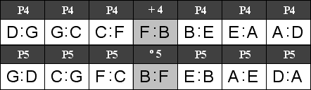 The Perfect Fourths and Fifths can be arranged cyclically around the central Augmented Fourth and Diminished Fifth.