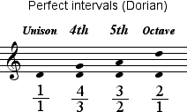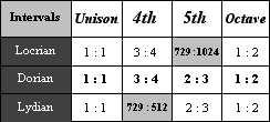 These three modes are shown below in notation with ratios. Lydian and Locrian intervals which differ from those of Dorian are shaded just as they are in the table above.